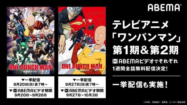 テレビ&ビデオエンターテインメント「ABEMA(アベマ)」の「ABEMAアニメ2チャンネル」において、『ワンパンマン』第1期・第2期の全話一挙配信が行われることが決定!