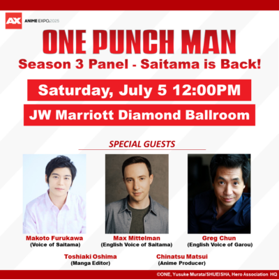 Don’t miss out on new information about the upcoming season and insight about the whole series with guest appearances by Makoto Furukawa (voice of Saitama), Max Mittelman (English voice of Saitama), Greg Chun (English voice of Garou), Toshiaki Oshima (Editor of the Manga “One-Punch Man”) and Chinatsu Matsui (Producer of the Anime “One-Punch Man”)!