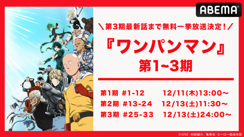 「ABEMA」にて『ワンパンマン』第1期・第2期全話と第3期最新話までの振り返り一挙放送が決定しました。