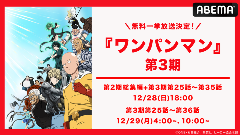 また、「ABEMAビデオ」にて『ワンパンマン』第2期総集編及び第3期第11話までの無料視聴が可能となります!