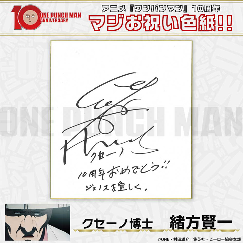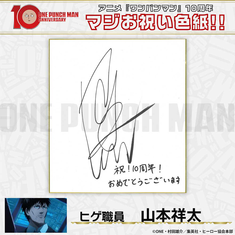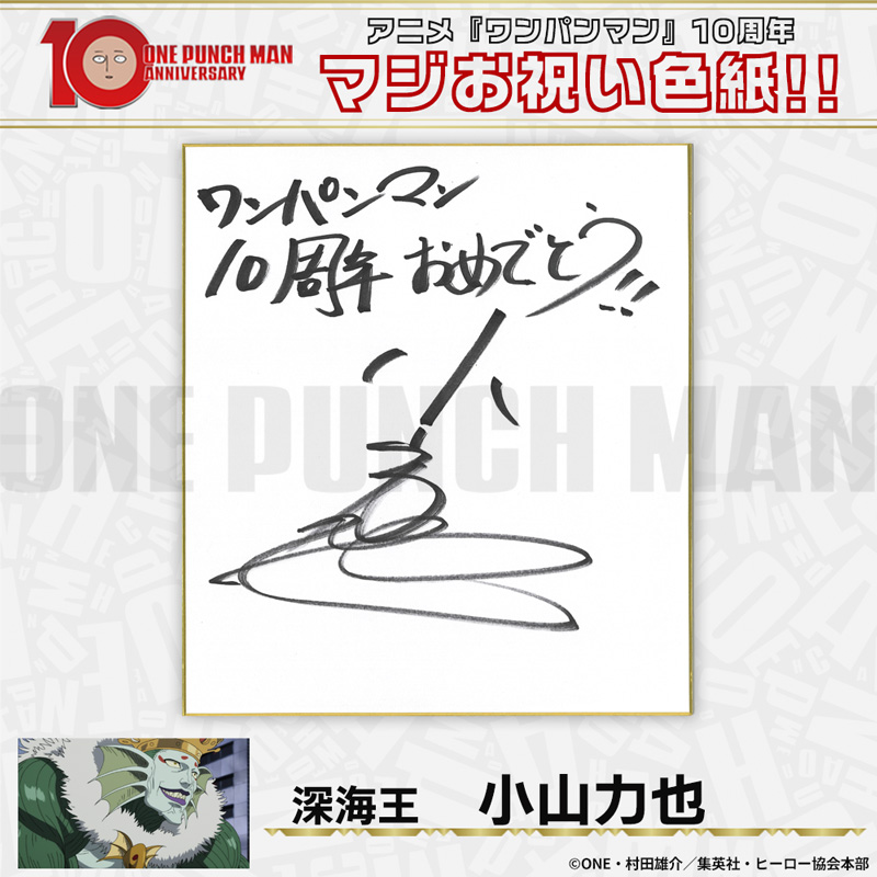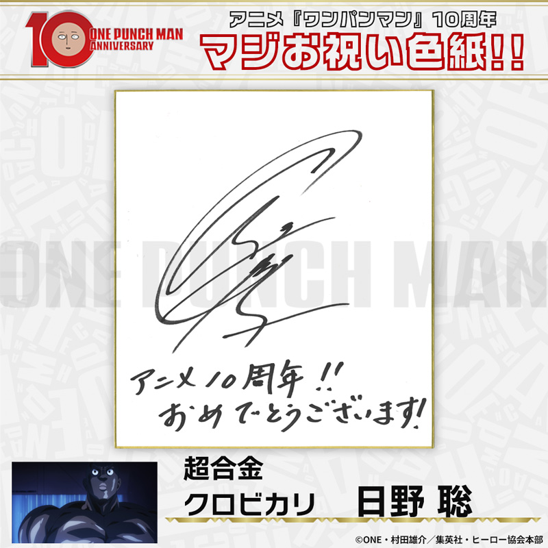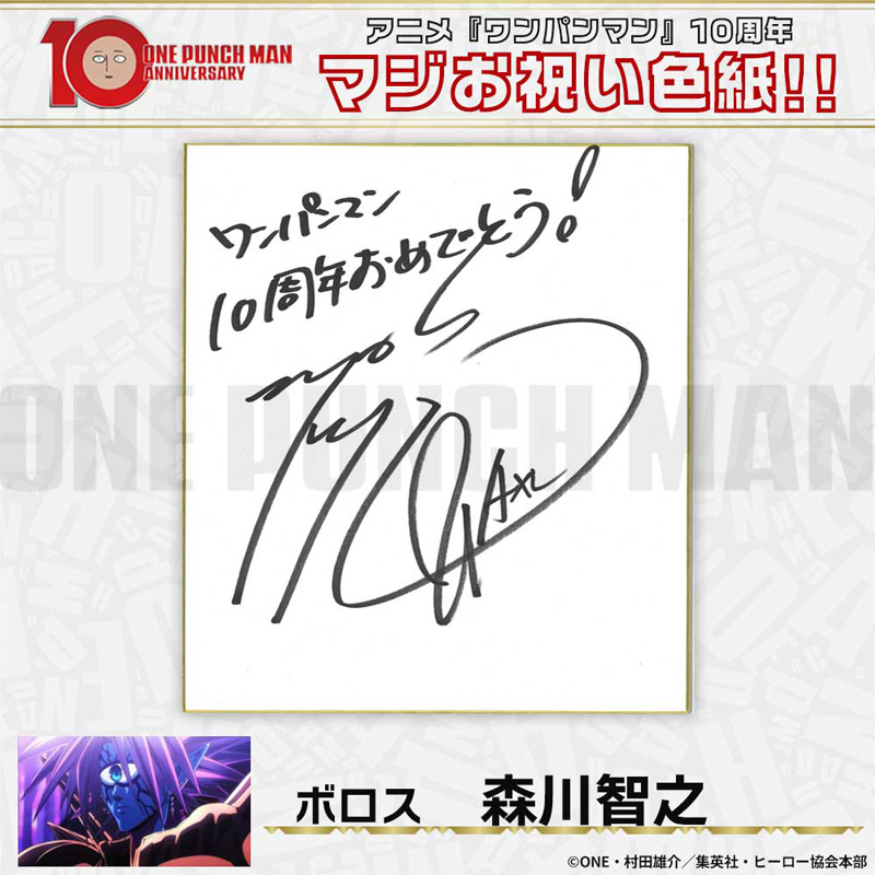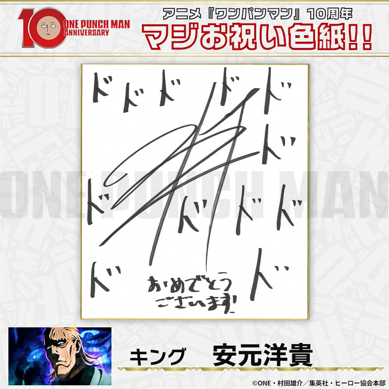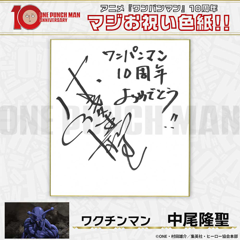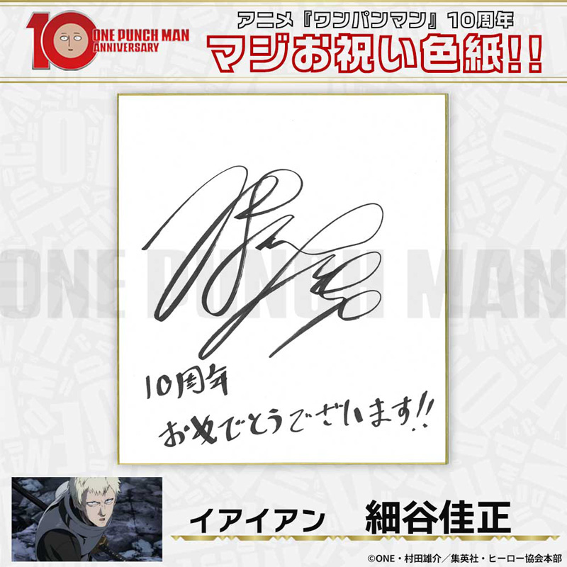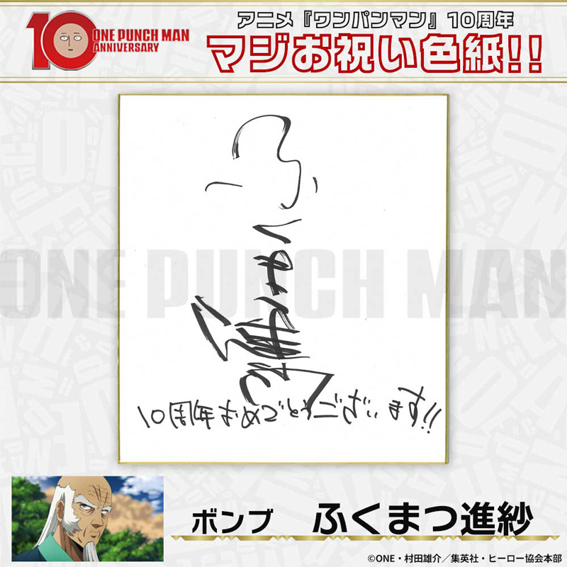 10周年マジお祝い色紙 サイタマ役 古川慎 ジェノス役 石川界人 無免ライダー役 中村悠一 地獄のフブキ役 早見沙織 イケメン仮面アマイマスク役 宮野真守 ぷりぷりプリズナー役 小野坂昌也 金属バット役 羽多野渉 タンクトップマスター役 小西克幸 閃光のフラッシュ役 鳥海浩輔 番犬マン役 うえだゆうじ 超合金クロビカリ役 日野聡 豚神役 浪川大輔 駆動騎士役 上田燿司 ゾンビマン役 櫻井孝宏 キング役 安元洋貴 メタルナイト役 玄田哲章 童帝役 高山みなみ アトミック侍役 津田健次郎 シルバーファング役 山路和弘 戦慄のタツマキ役 悠木碧 ワクチンマン役 中尾隆聖 カニランテ役 徳本恭敏 モスキート娘役 沢城みゆき ハンマーヘッド役 高木渉 音速のソニック役 梶裕貴 クセーノ博士役 緒方賢一 ヒゲ職員役 山本祥太 蛇咬拳のスネック役 三木眞一郎 昆布インフィニティ役 内藤有海 スティンガー役 関智一 シッチ役 飛田展男 深海王役 小山力也 イアイアン役 細谷佳正 メルザルガルド役 内山昂輝 ボロス役 森川智之 チャランコ役 増田俊樹 ボンブ役 ふくまつ進紗 タレオ役 藤原夏海 スイリュー役 松風雅也 ギョロギョロ役 子安武人