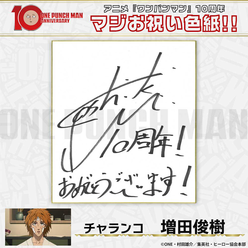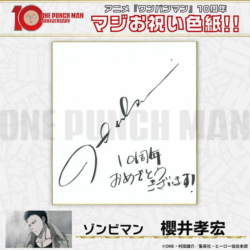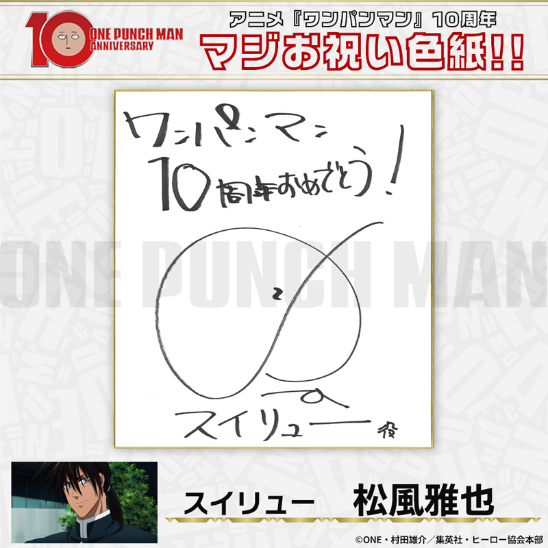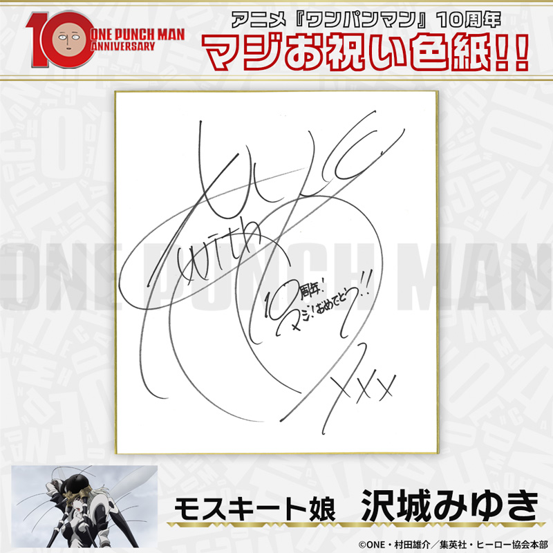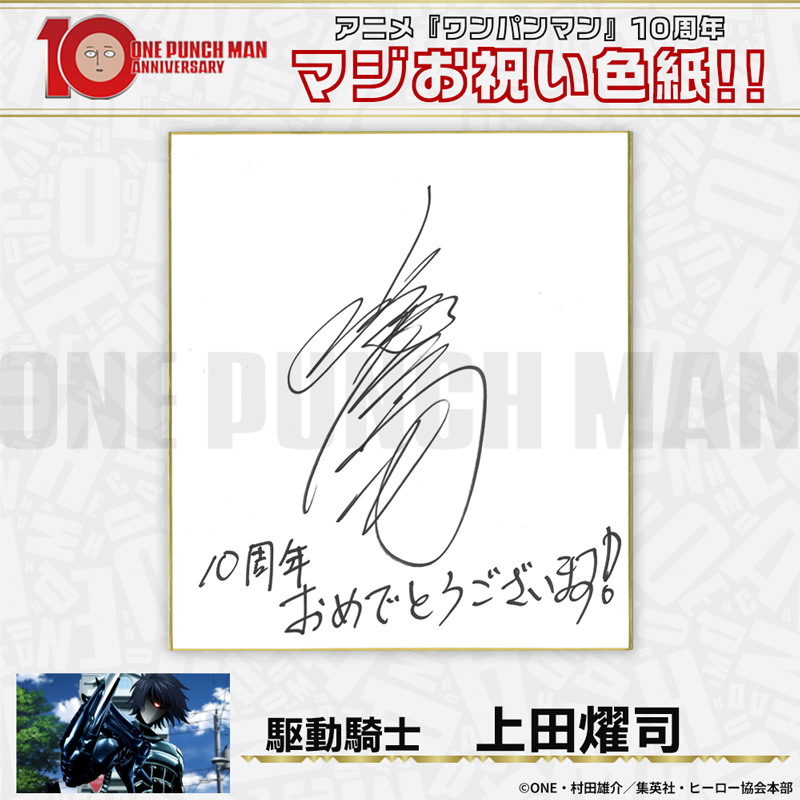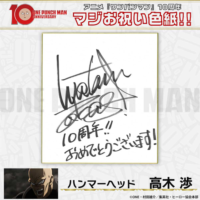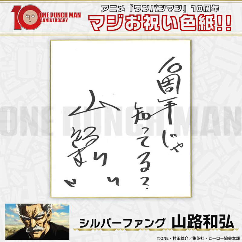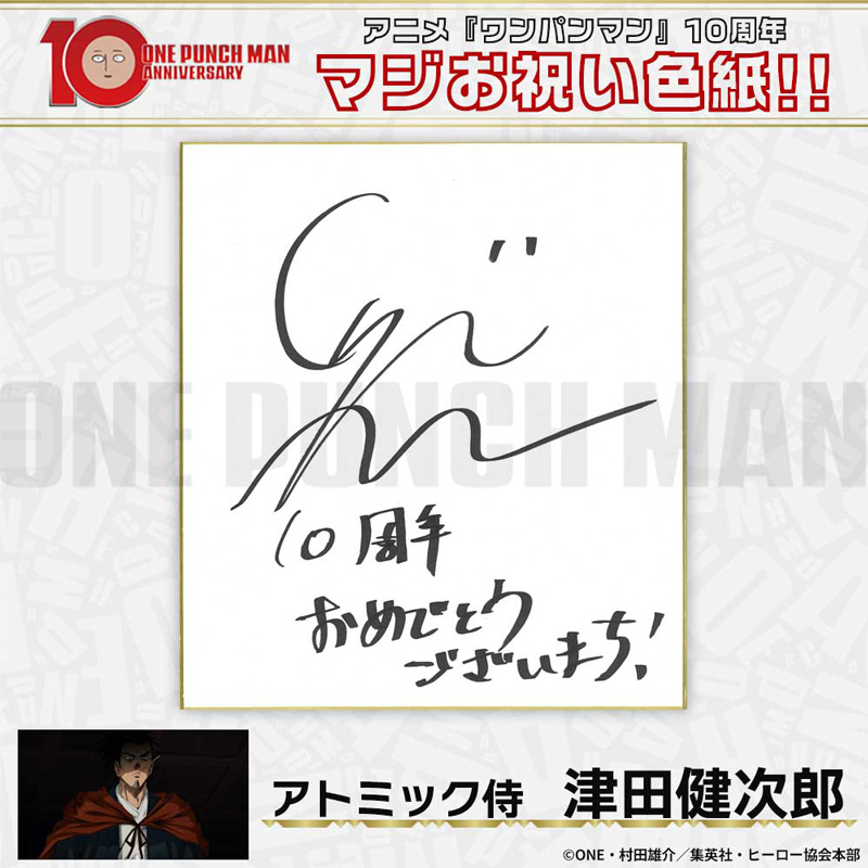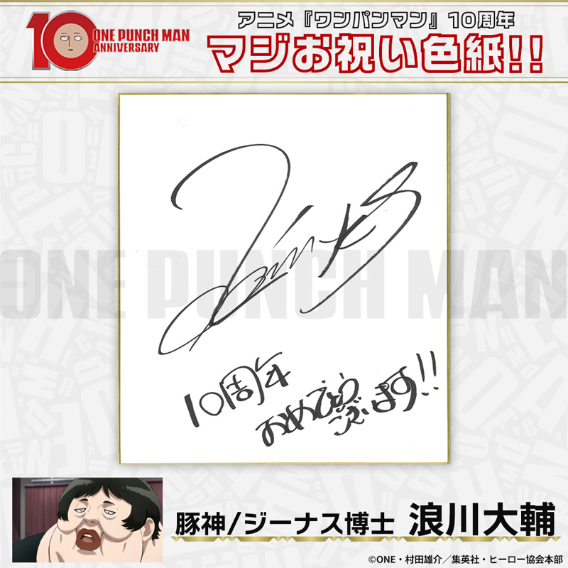 10周年マジお祝い色紙 サイタマ役 古川慎 ジェノス役 石川界人 無免ライダー役 中村悠一 地獄のフブキ役 早見沙織 イケメン仮面アマイマスク役 宮野真守 ぷりぷりプリズナー役 小野坂昌也 金属バット役 羽多野渉 タンクトップマスター役 小西克幸 閃光のフラッシュ役 鳥海浩輔 番犬マン役 うえだゆうじ 超合金クロビカリ役 日野聡 豚神役 浪川大輔 駆動騎士役 上田燿司 ゾンビマン役 櫻井孝宏 キング役 安元洋貴 メタルナイト役 玄田哲章 童帝役 高山みなみ アトミック侍役 津田健次郎 シルバーファング役 山路和弘 戦慄のタツマキ役 悠木碧 ワクチンマン役 中尾隆聖 カニランテ役 徳本恭敏 モスキート娘役 沢城みゆき ハンマーヘッド役 高木渉 音速のソニック役 梶裕貴 クセーノ博士役 緒方賢一 ヒゲ職員役 山本祥太 蛇咬拳のスネック役 三木眞一郎 昆布インフィニティ役 内藤有海 スティンガー役 関智一 シッチ役 飛田展男 深海王役 小山力也 イアイアン役 細谷佳正 メルザルガルド役 内山昂輝 ボロス役 森川智之 チャランコ役 増田俊樹 ボンブ役 ふくまつ進紗 タレオ役 藤原夏海 スイリュー役 松風雅也 ギョロギョロ役 子安武人
