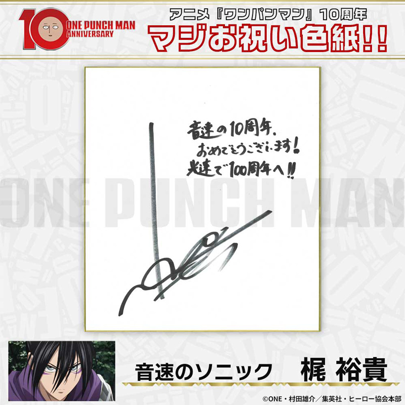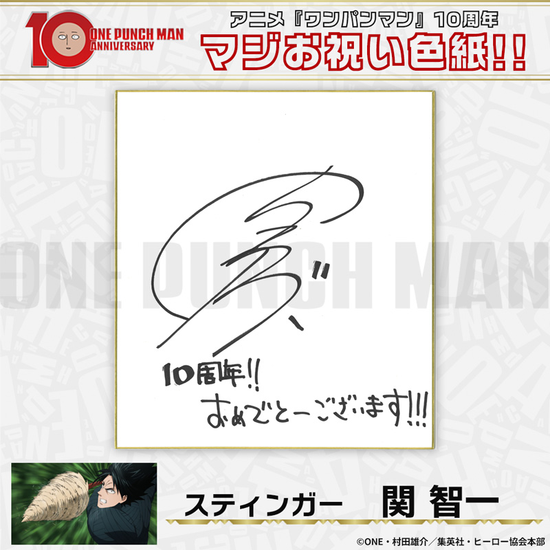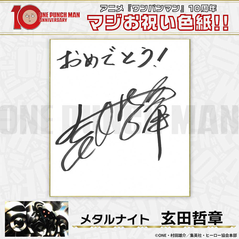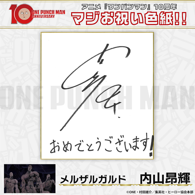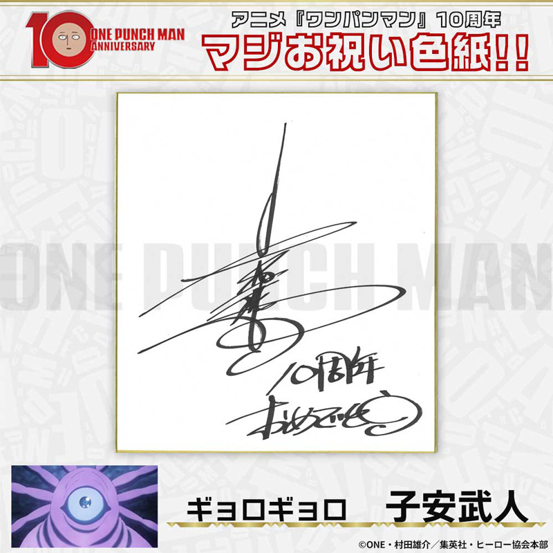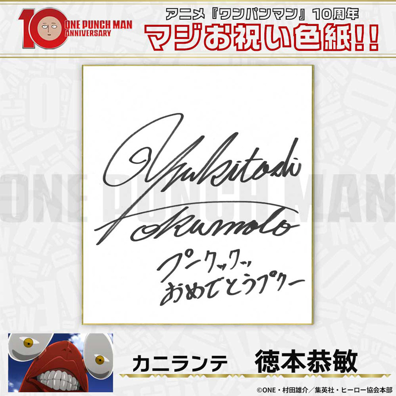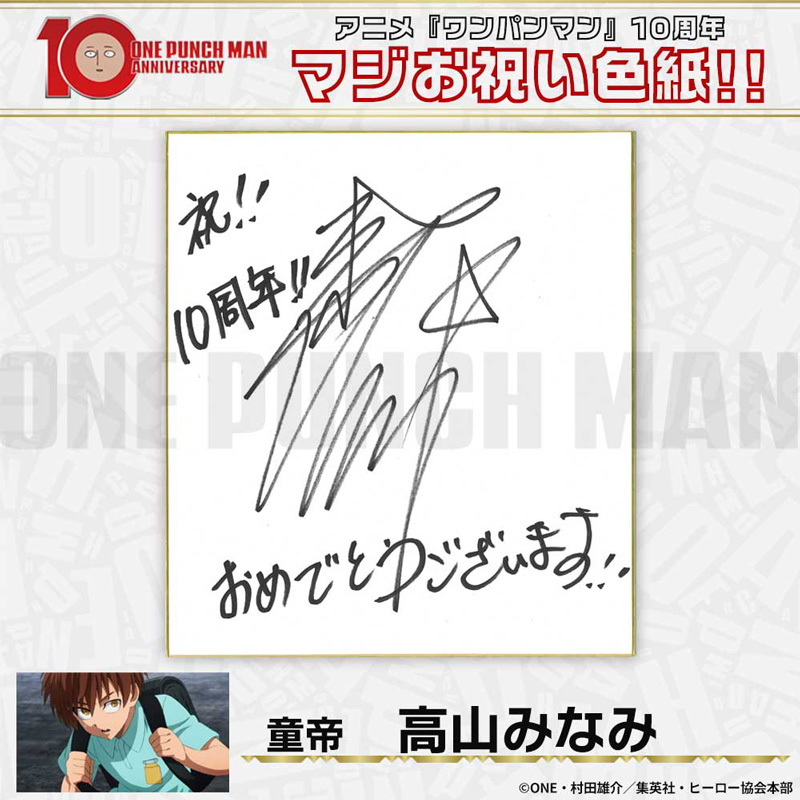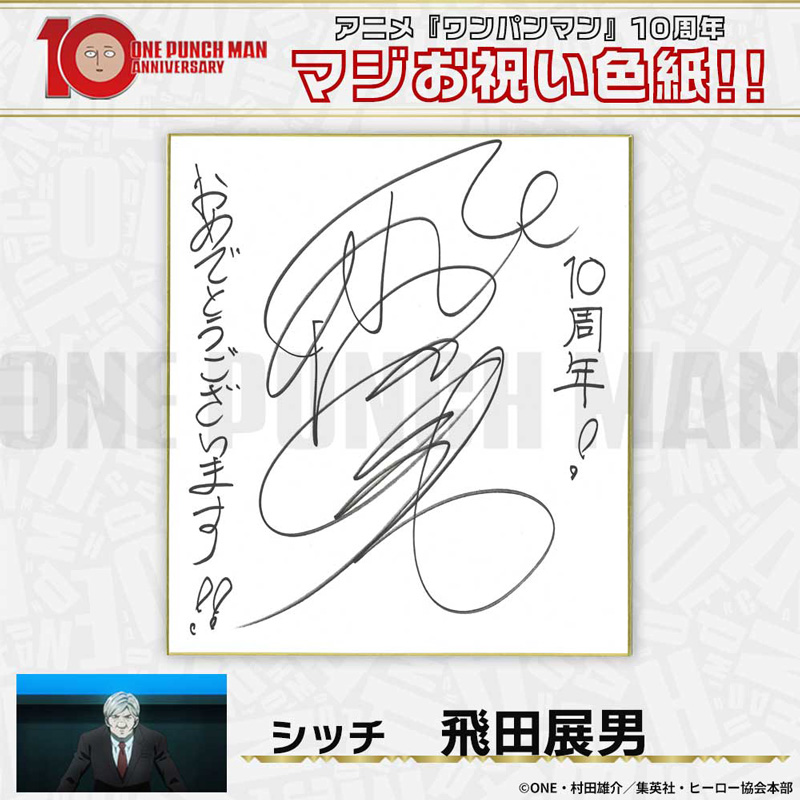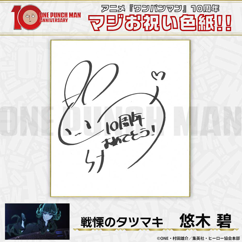 10周年マジお祝い色紙 サイタマ役 古川慎 ジェノス役 石川界人 無免ライダー役 中村悠一 地獄のフブキ役 早見沙織 イケメン仮面アマイマスク役 宮野真守 ぷりぷりプリズナー役 小野坂昌也 金属バット役 羽多野渉 タンクトップマスター役 小西克幸 閃光のフラッシュ役 鳥海浩輔 番犬マン役 うえだゆうじ 超合金クロビカリ役 日野聡 豚神役 浪川大輔 駆動騎士役 上田燿司 ゾンビマン役 櫻井孝宏 キング役 安元洋貴 メタルナイト役 玄田哲章 童帝役 高山みなみ アトミック侍役 津田健次郎 シルバーファング役 山路和弘 戦慄のタツマキ役 悠木碧 ワクチンマン役 中尾隆聖 カニランテ役 徳本恭敏 モスキート娘役 沢城みゆき ハンマーヘッド役 高木渉 音速のソニック役 梶裕貴 クセーノ博士役 緒方賢一 ヒゲ職員役 山本祥太 蛇咬拳のスネック役 三木眞一郎 昆布インフィニティ役 内藤有海 スティンガー役 関智一 シッチ役 飛田展男 深海王役 小山力也 イアイアン役 細谷佳正 メルザルガルド役 内山昂輝 ボロス役 森川智之 チャランコ役 増田俊樹 ボンブ役 ふくまつ進紗 タレオ役 藤原夏海 スイリュー役 松風雅也 ギョロギョロ役 子安武人